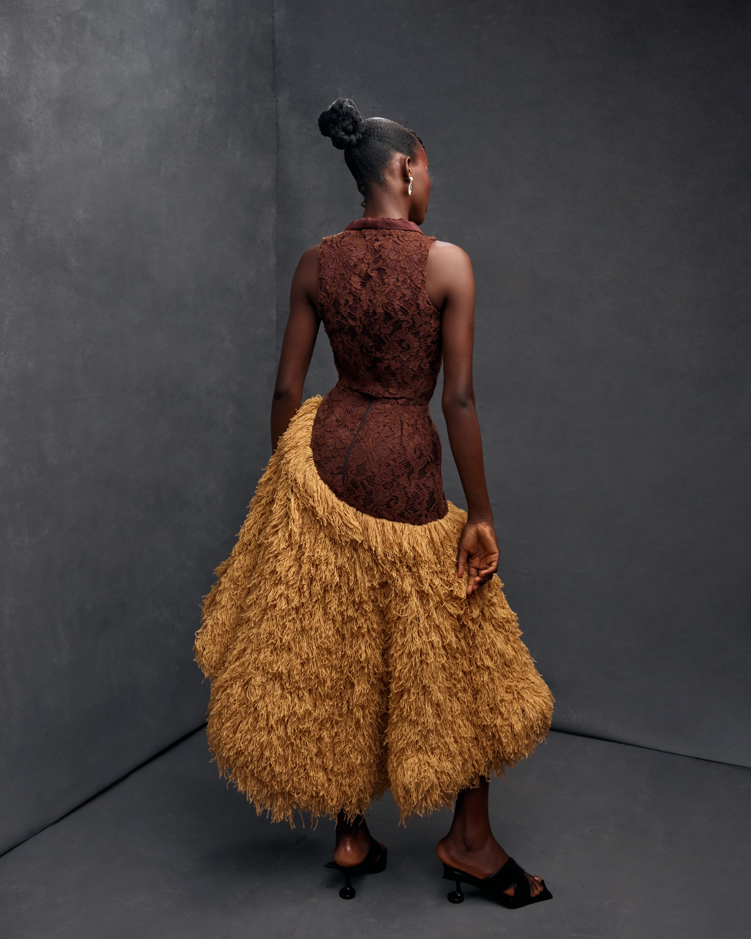 The Oshobor brand expresses vulnerability and tenderness through design. Peter uses the garments to tell stories that include softness and vulnerability, weaving it into the how the brand is represented on the runway and published editorial looks.